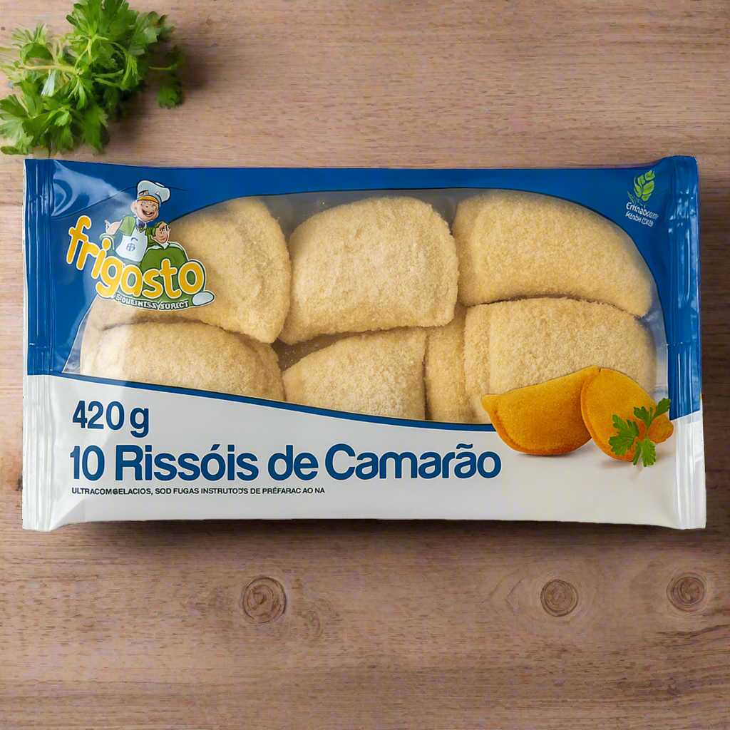 Each pack includes 10 crispy, breaded turnovers (about 42 g each) filled with a creamy shrimp (camarão) filling. Perfect for parties, starters, or quick family meals—cook straight from frozen in the fryer or oven.